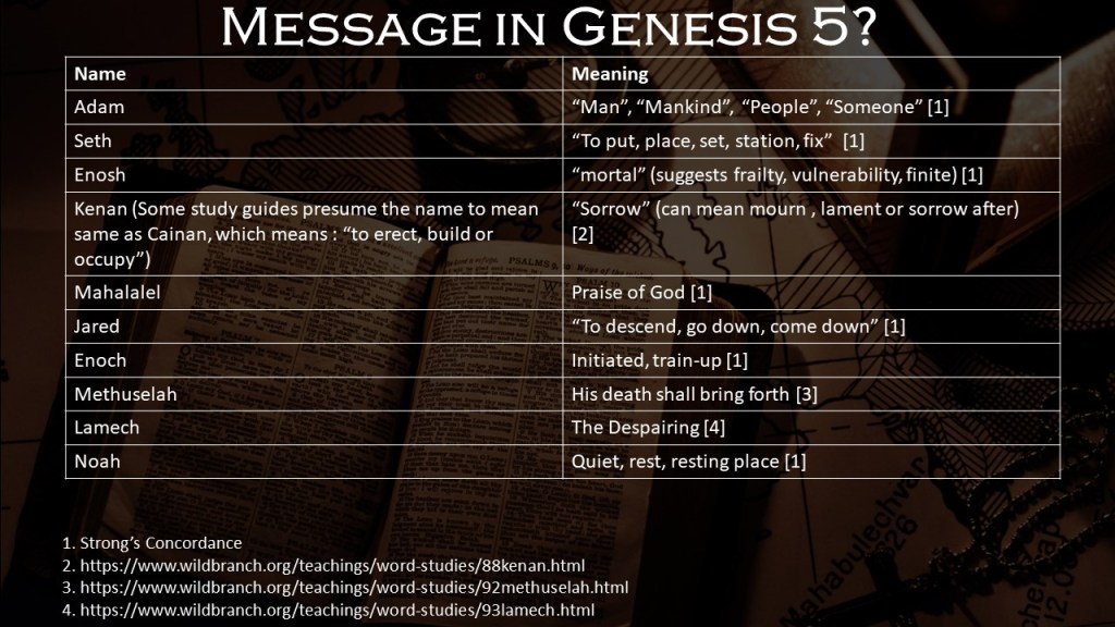 For the most part, when we get to the sections of Scripture that list genealogies, we generally skip past it or superficially read over it. One such genealogy is given in Genesis Chapter 5, named the “book of the generations of Adam” (Genesis 5:1). At a first glance this Chapter offers very little apart from historical facts regarding the family line from Adam through to Noah. However, if you do a little homework, you will be amazed to find a Messianic prophecy hidden within this specific genealogy; more specific, the names. For the most part, the meanings of the names are readily available in a good Bible concordance, such as The Strong’s Exhaustive Concordance of the Bible, or Bible software that use such concordances or Hebrew dictionaries, such as e-Sword.